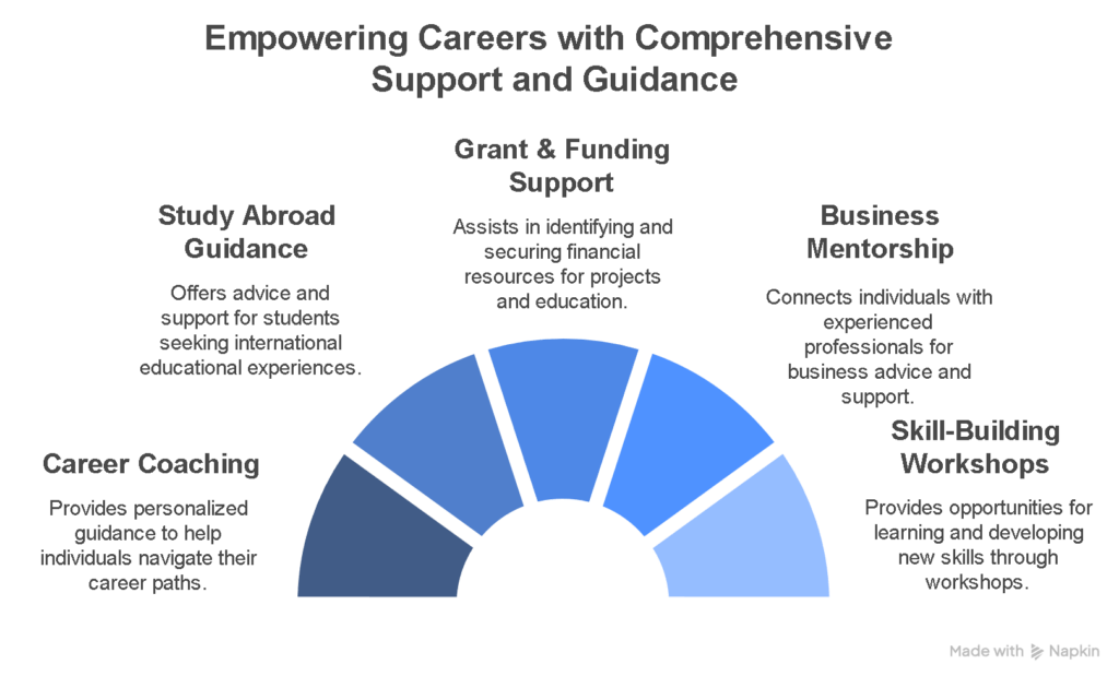 Through our user-friendly online platform, individuals can book complimentary one-on-one career advisory sessions with experienced professionals. Services offered include CV reviews, career clarity sessions, study support, business development strategies, and business growth consulting.